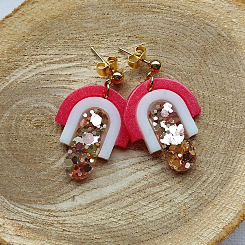 Deze shiny oorbellen van de Bella collectie zijn gemaakt van epoxy met gouden glitters. De oorstekers zijn gemaakt van roestvrij staal. De oorbel is in lengte +/- 3 cm.