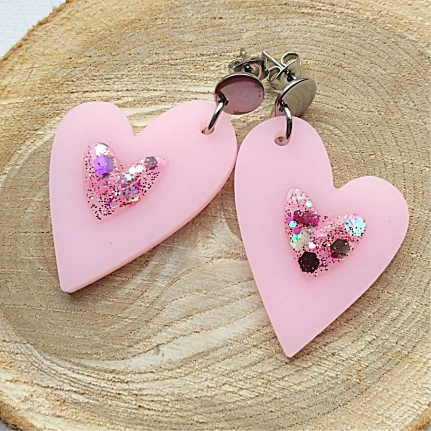 Deze romantische hangers zijn gemaakt van epoxy met roze glitters. De oorsteker is gemaakt van roestvrij staal. De oorbel is in lengte +/- 5 cm.