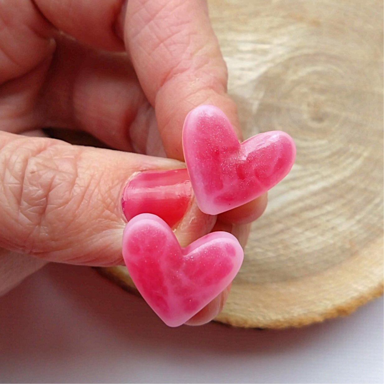 Deze hartjes knopjes zijn gemaakt van epoxy. De oorsteker is gemaakt van roestvrij staal. Het knopje is +/- 2 cm in doorsnee.