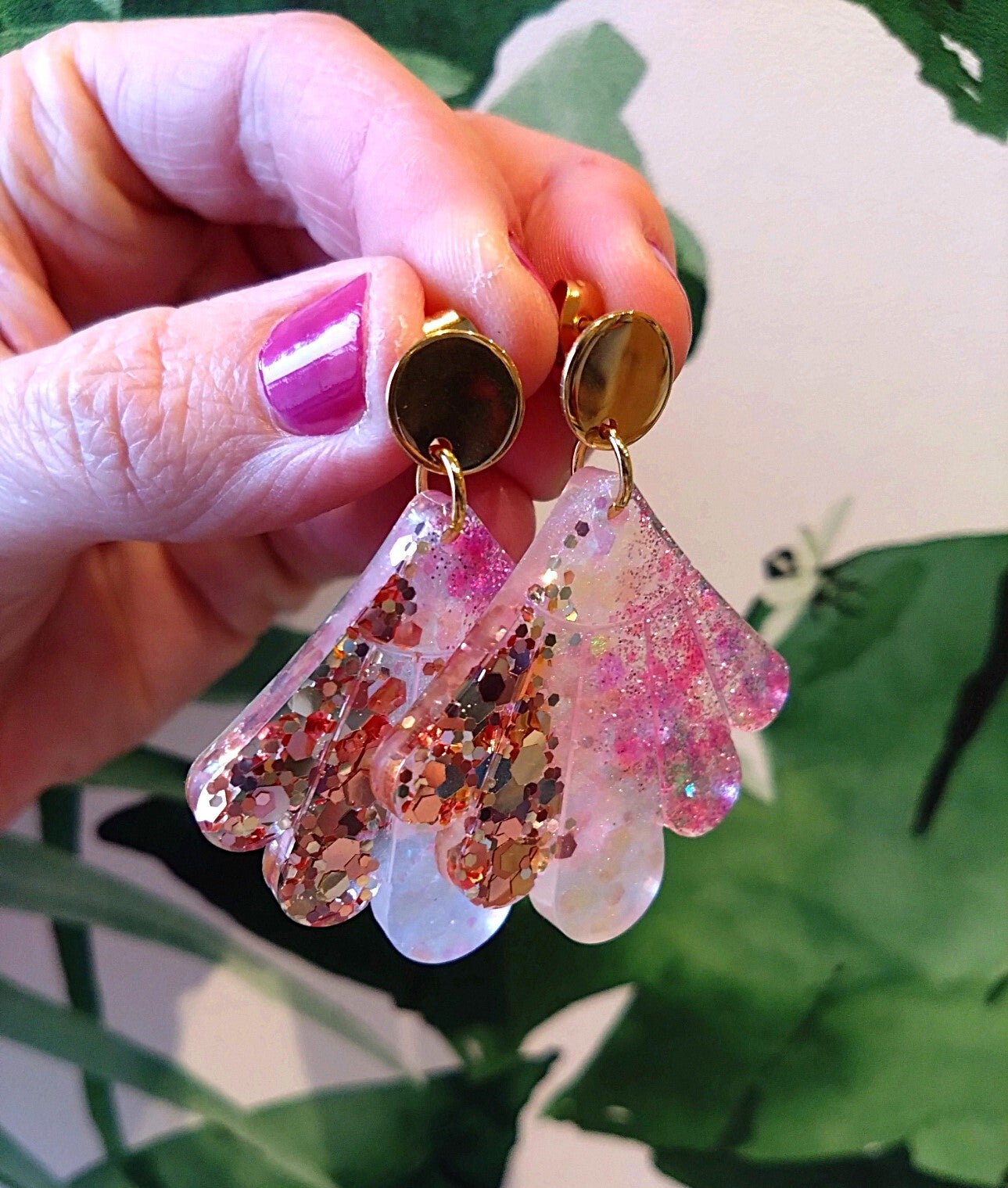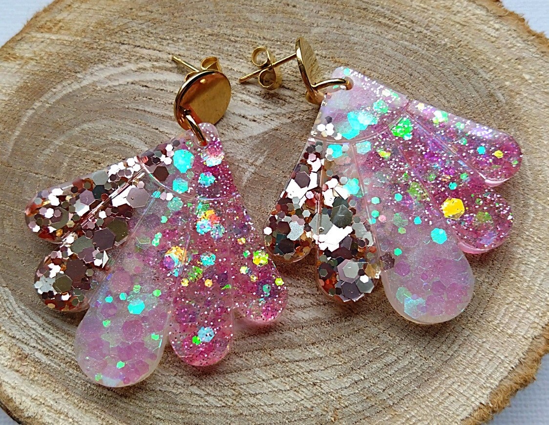 Deze shiny oorbel van de Lolita collectie is gemaakt van epoxy met roze, witte en gouden glitters. De goudkleurige oorsteker is gemaakt van roestvrij staal. De oorbel is in lengte +/- 5cm.