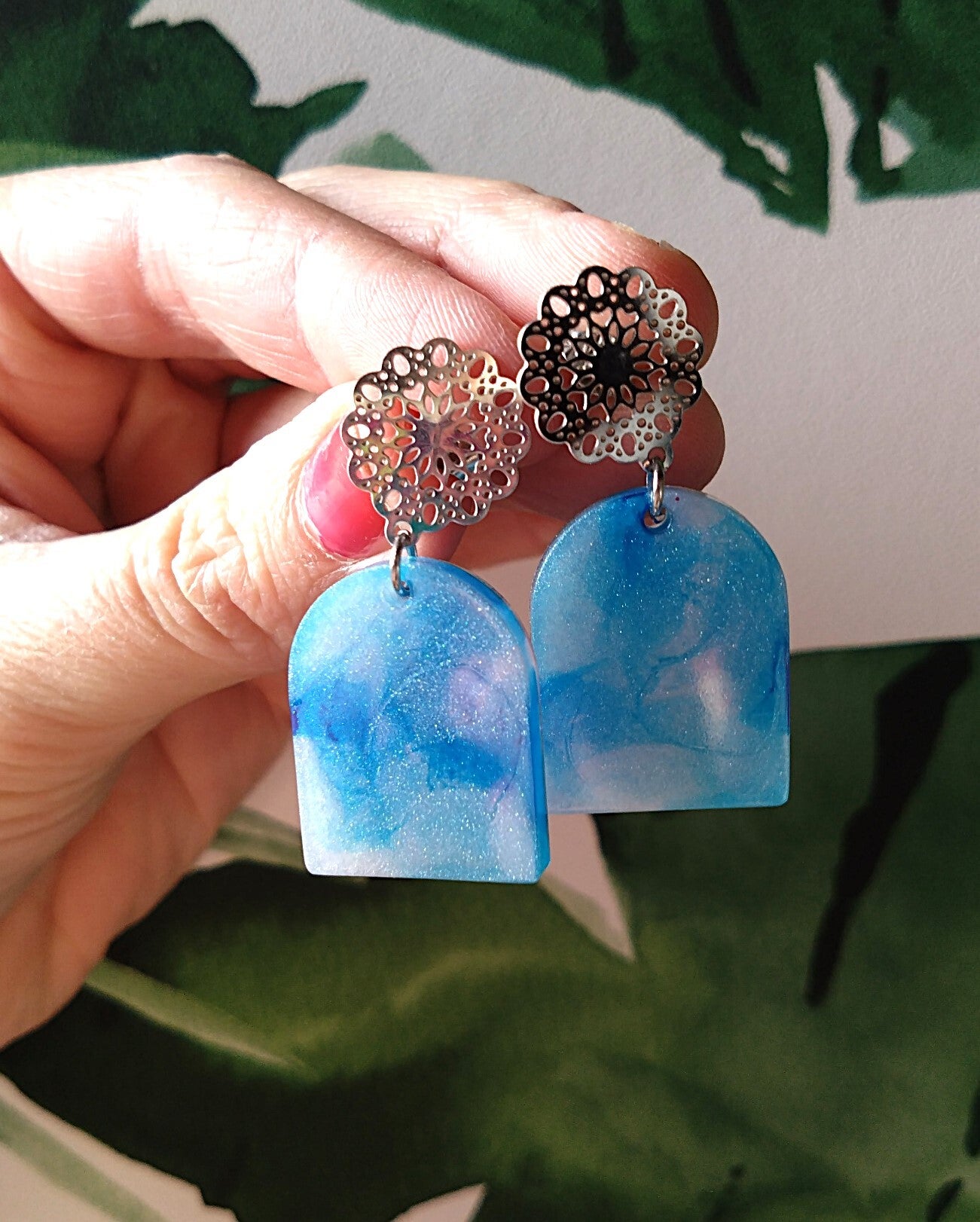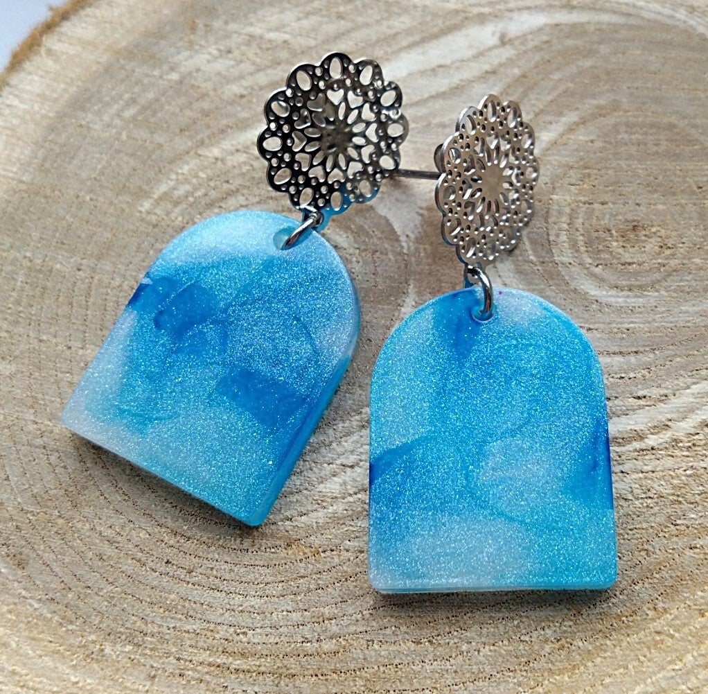 Deze zeeblauw met glans hangers zijn gemaakt met epoxy. De oorsteker is gemaakt van roestvrij staal in de kleur zilver. In lengte zijn de oorbellen ongeveer 4 cm.