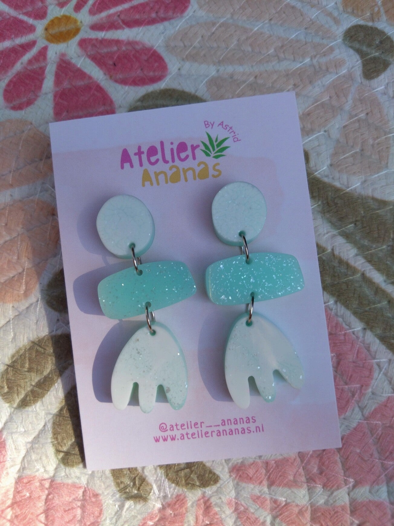 Deze zachtgroene hanger van de Lente collectie is gemaakt van epoxy. De oorsteker is gemaakt van roestvrij staal. De oorbel is in lengte +/- 5cm.