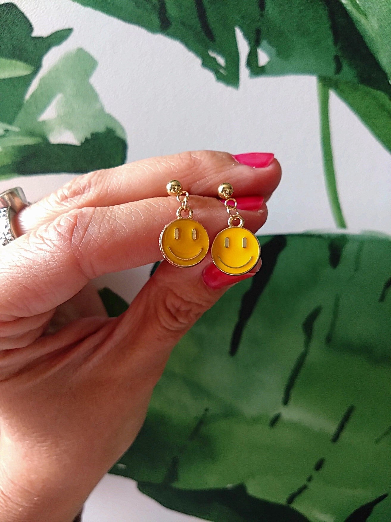 Hier wordt je toch vrolijk van! Een gele smiley bedel aan een roestvrij stalen oorsteker in goudkleur. Ook in zilverkleurig mogelijk. De oorbel is in lengte +/- 2cm.