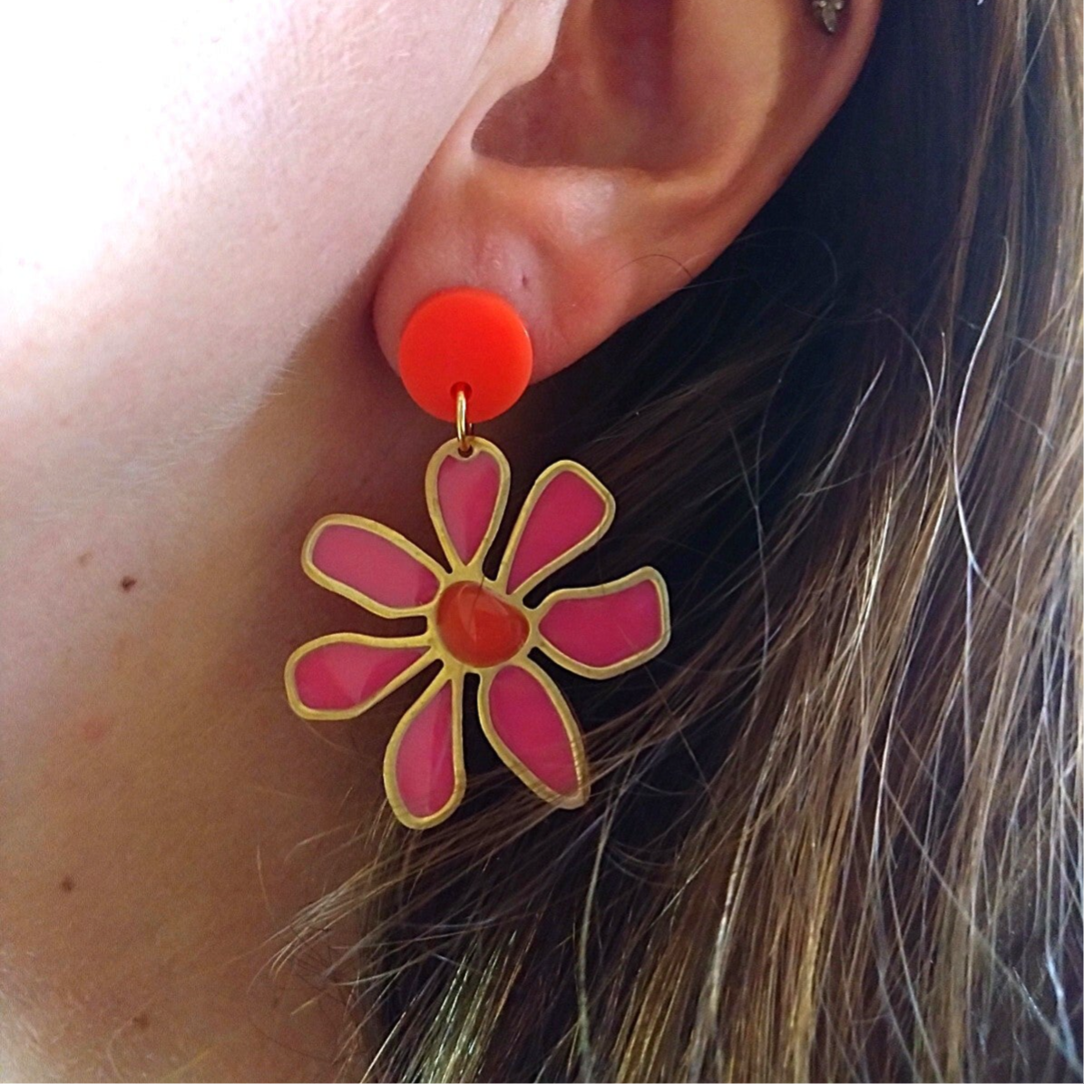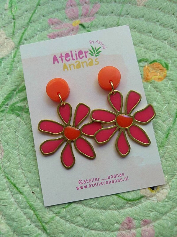 Een prachtige bloem hanger, gemaakt van epoxy. Als je de hanger tegen de zon in houdt, krijg je een heel mooi glas-in-lood effect. De oorsteker is gemaakt van roestvrij staal. De oorbel is in lengte +/- 4,5cm.