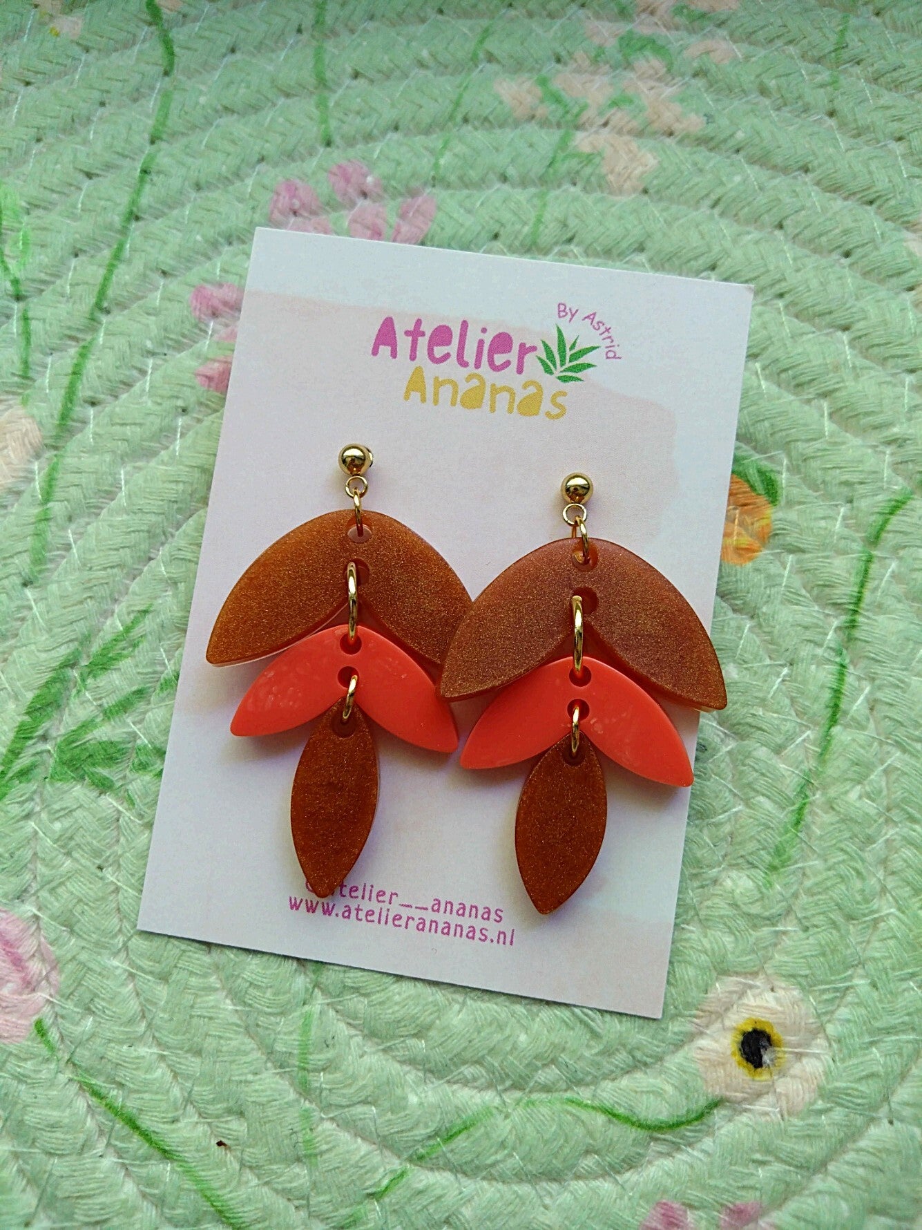 Deze sierlijke hangers zijn gemaakt met epoxy in de kleur glanzend brons en rood/oranje. De oorsteker is goudkleurig en gemaakt van roestvrij staal. De oorbel is in lengte +/- 5,5cm.