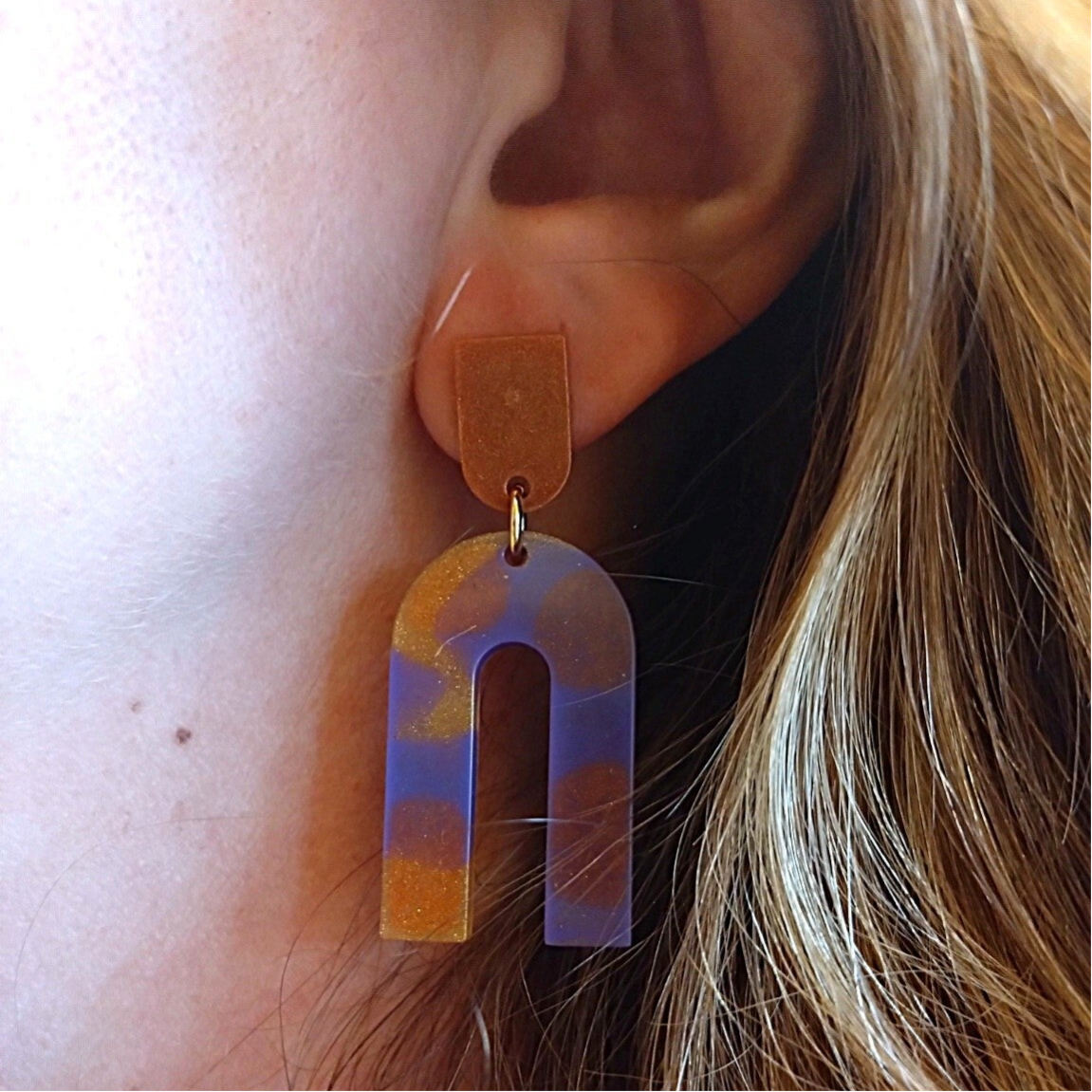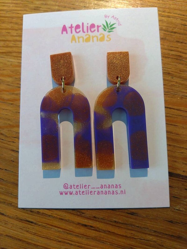 Deze prachtige glansgoud/brons en donkerpaarse hangers zijn gemaakt met epoxy. De oorsteker is gemaakt van roestvrij staal in de kleur goud. In lengte zijn de oorbellen ongeveer 5 cm.