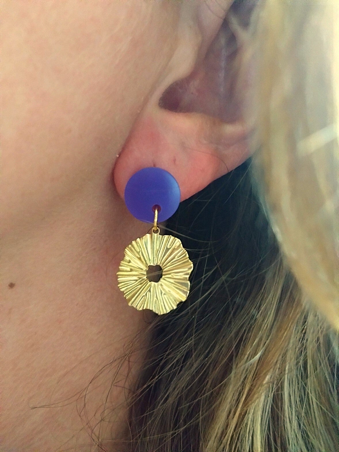 Deze kleine hangers zijn gemaakt met epoxy. Het bedeltje en de oorsteker zijn gemaakt van roestvrij staal in de kleur goud. In lengte zijn de oorbellen ongeveer 3 cm. Ook verkrijgbaar in de kleur bruin.