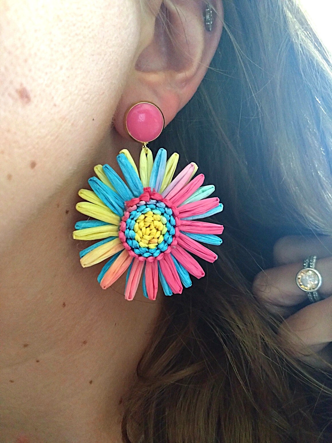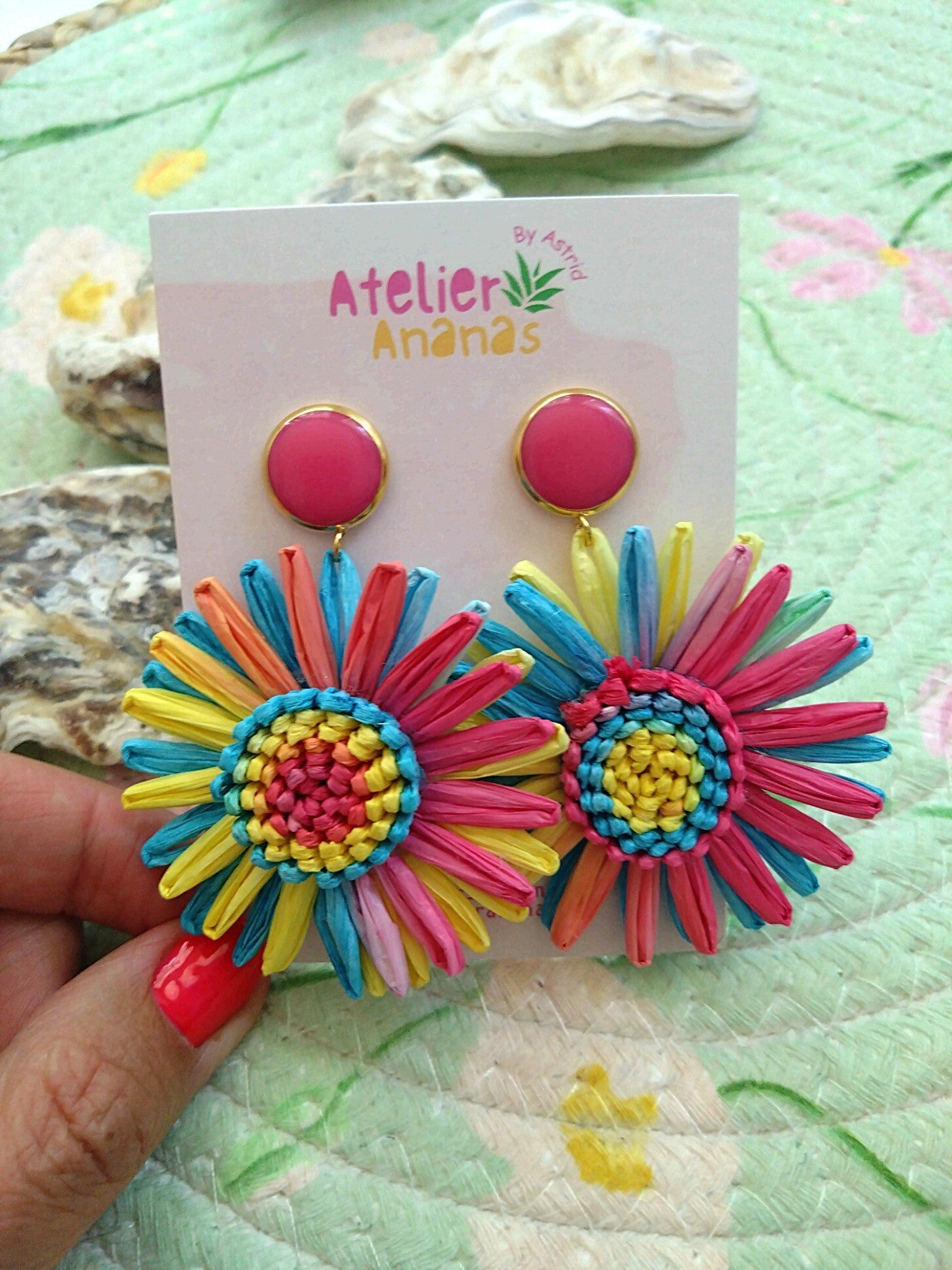 Deze vrolijke en kleurrijke raffia hangers zijn licht in gewicht. De hanger is gemaakt van raffia, een duurzaam materiaal gemaakt van de raffia palm. De oorsteker is van roestvrij staal en gevuld met roze epoxy.