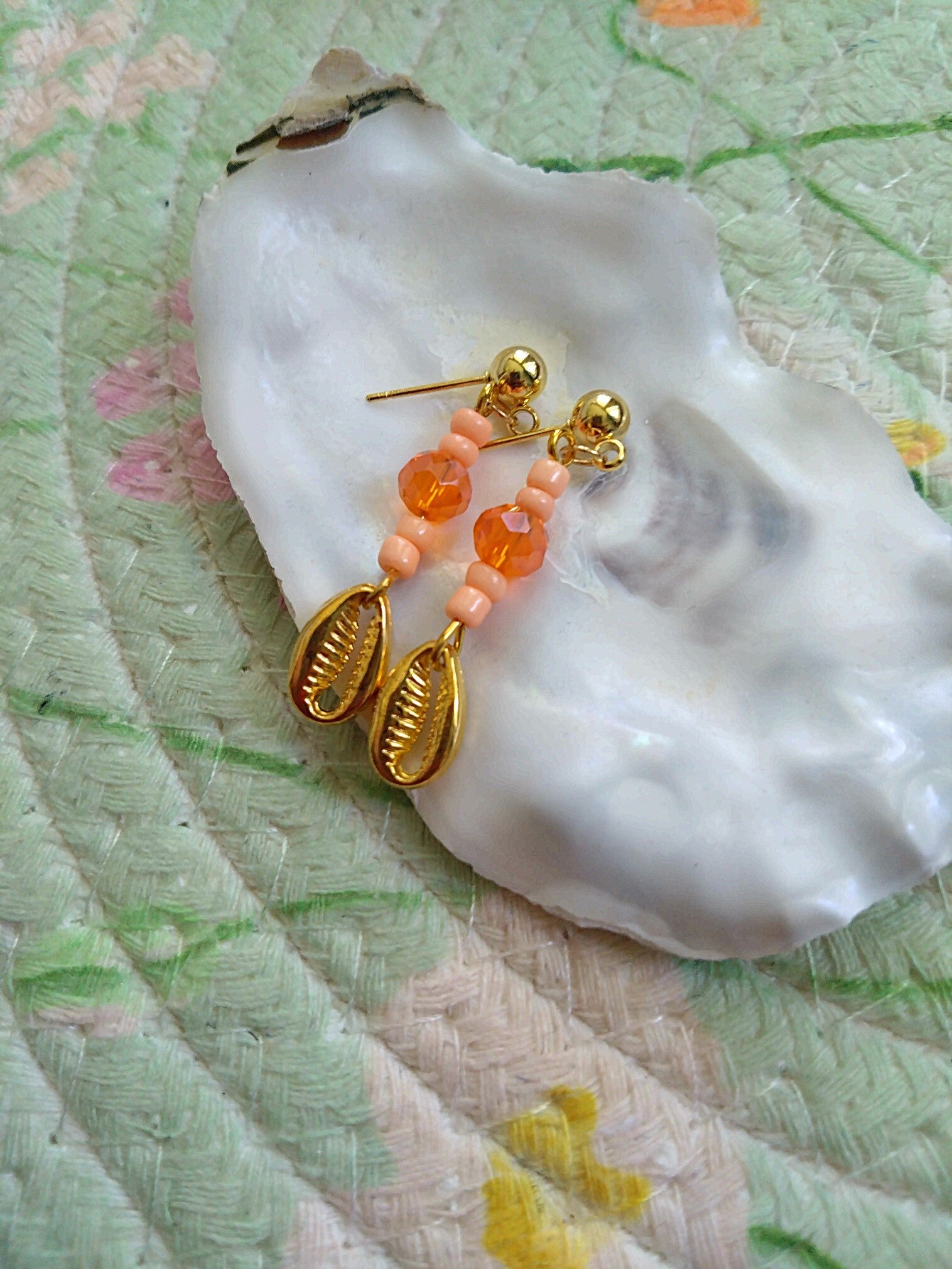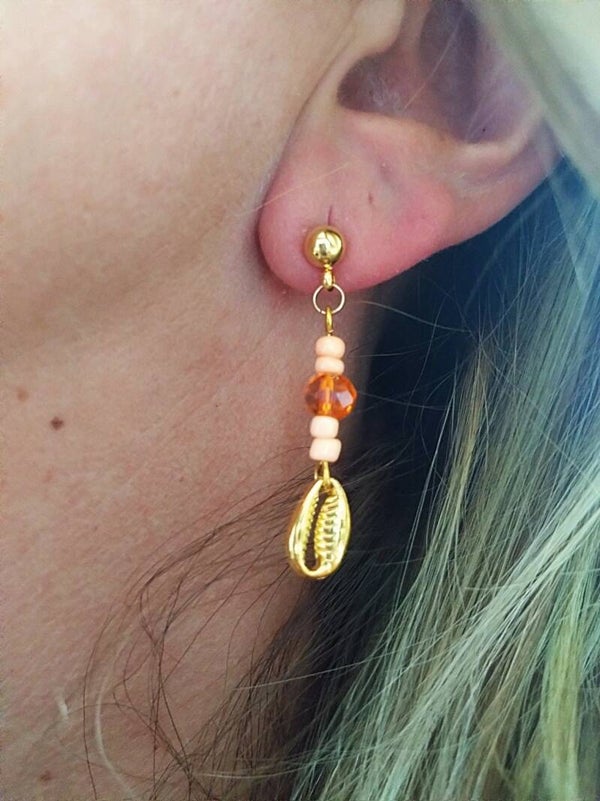 Deze zomerse hangers zijn gemaakt met kralen en mooie goudkleurige schelp bedels. De oorsteker is gemaakt van roestvrij staal in de kleur goud. In lengte zijn de oorbellen ongeveer 4 cm.