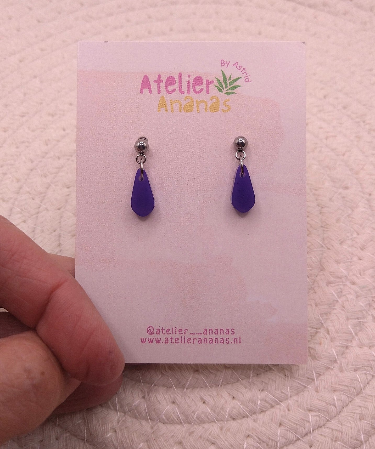 Deze subtiele oorbel is gemaakt van epoxy met de kleur paars. De oorsteker is gemaakt van roestvrij staal. De oorbel is in lengte +/- 2cm.