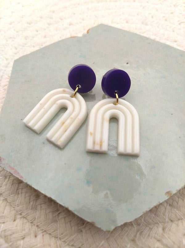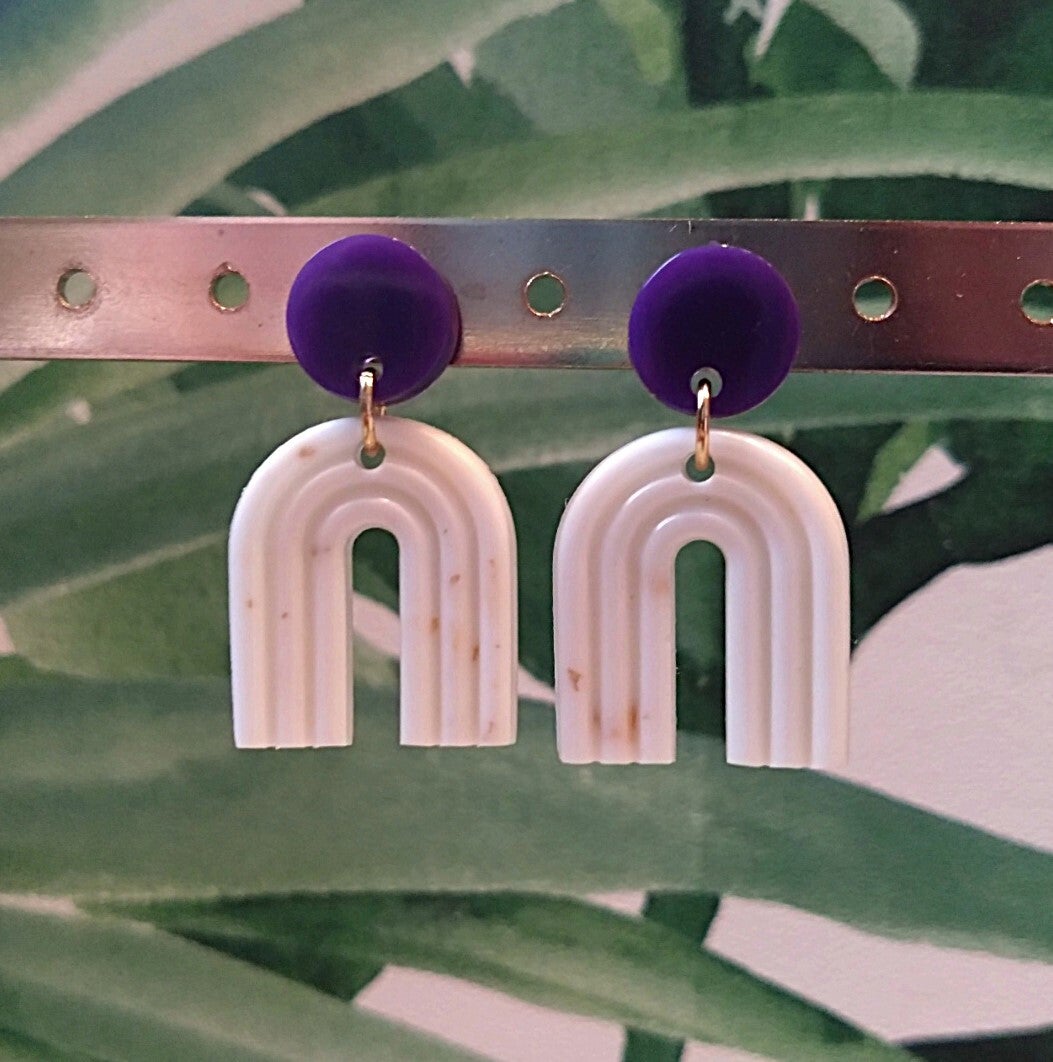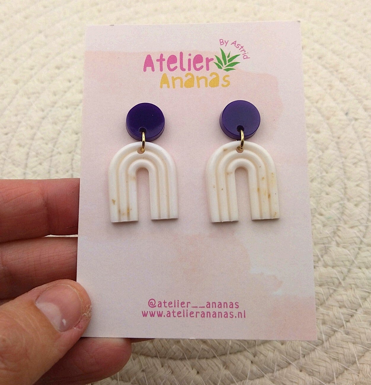 Deze shiny oorbel is gemaakt van epoxy in de kleuren donkerpaars en wit met gouden vlokken. De oorsteker is gemaakt van roestvrij staal. De oorbel is in lengte +/- 3,5cm.