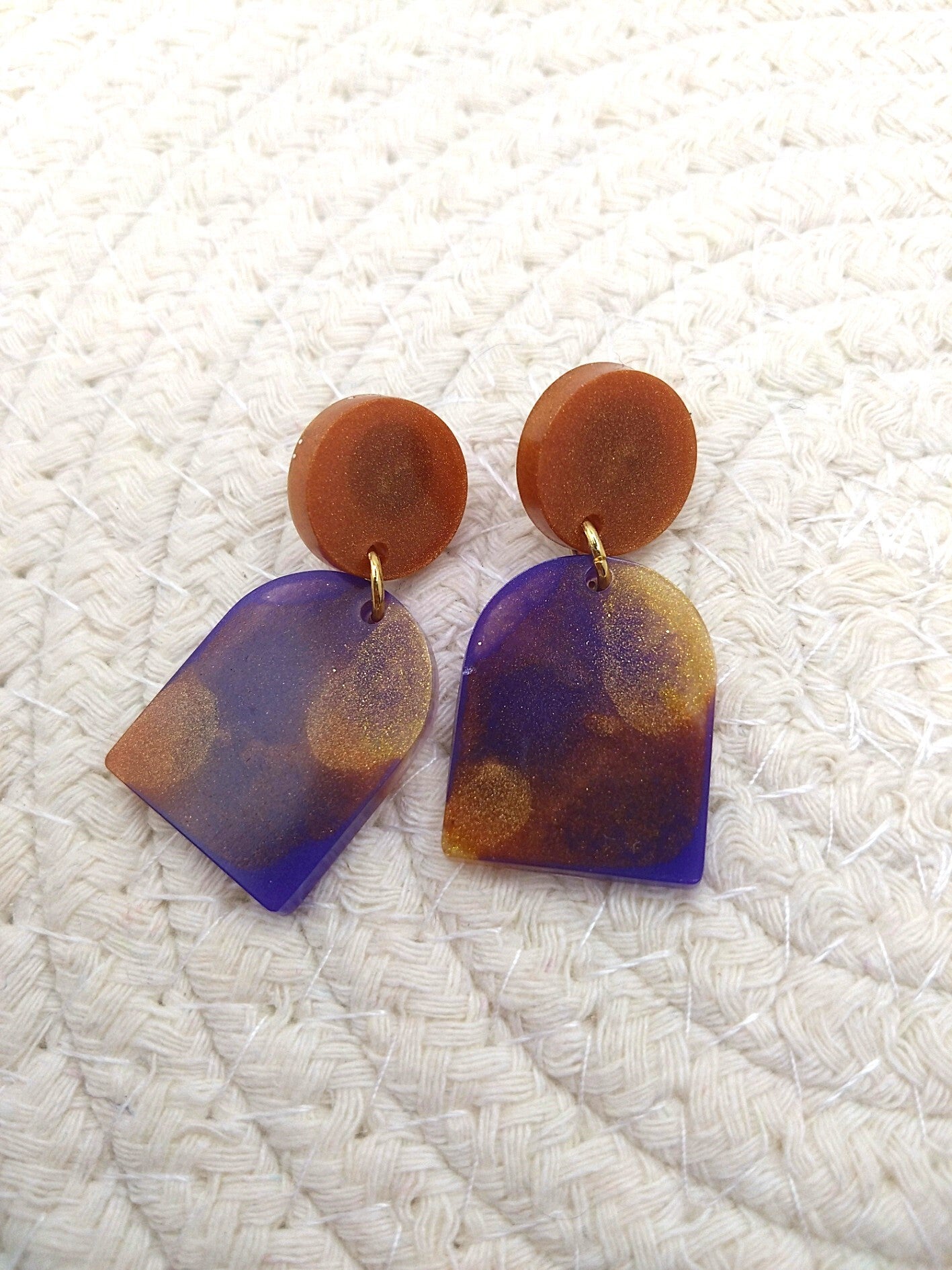 Deze shiny oorbel is gemaakt van epoxy in de kleuren donkerpaars, parelmoergoud en -brons. De oorsteker is gemaakt van roestvrij staal. De oorbel is in lengte +/- 4cm.