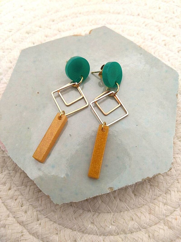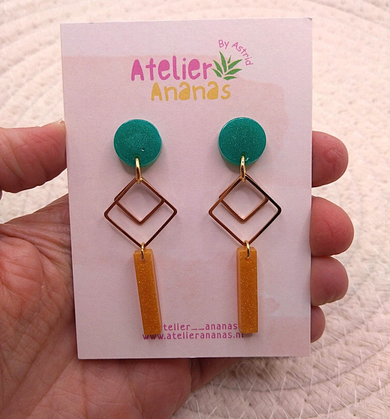 Deze klassieke hangers zijn gemaakt van epoxy in de kleuren groen en parelmoer goud. De oorsteker is gemaakt van roestvrij staal. De oorbel is in lengte +/- 5,5cm.