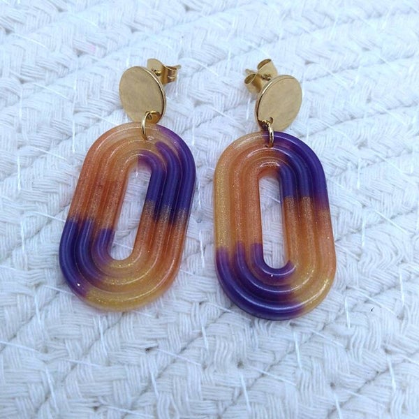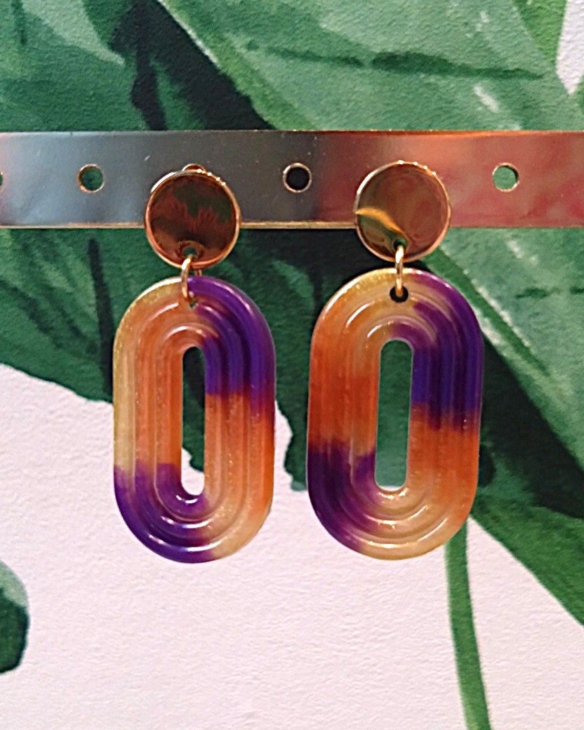 Deze shiny oorbel is gemaakt van epoxy in de kleuren paars, parelmoer goud en -brons. De oorsteker is gemaakt van roestvrij staal. De oorbel is in lengte +/- 4cm.
