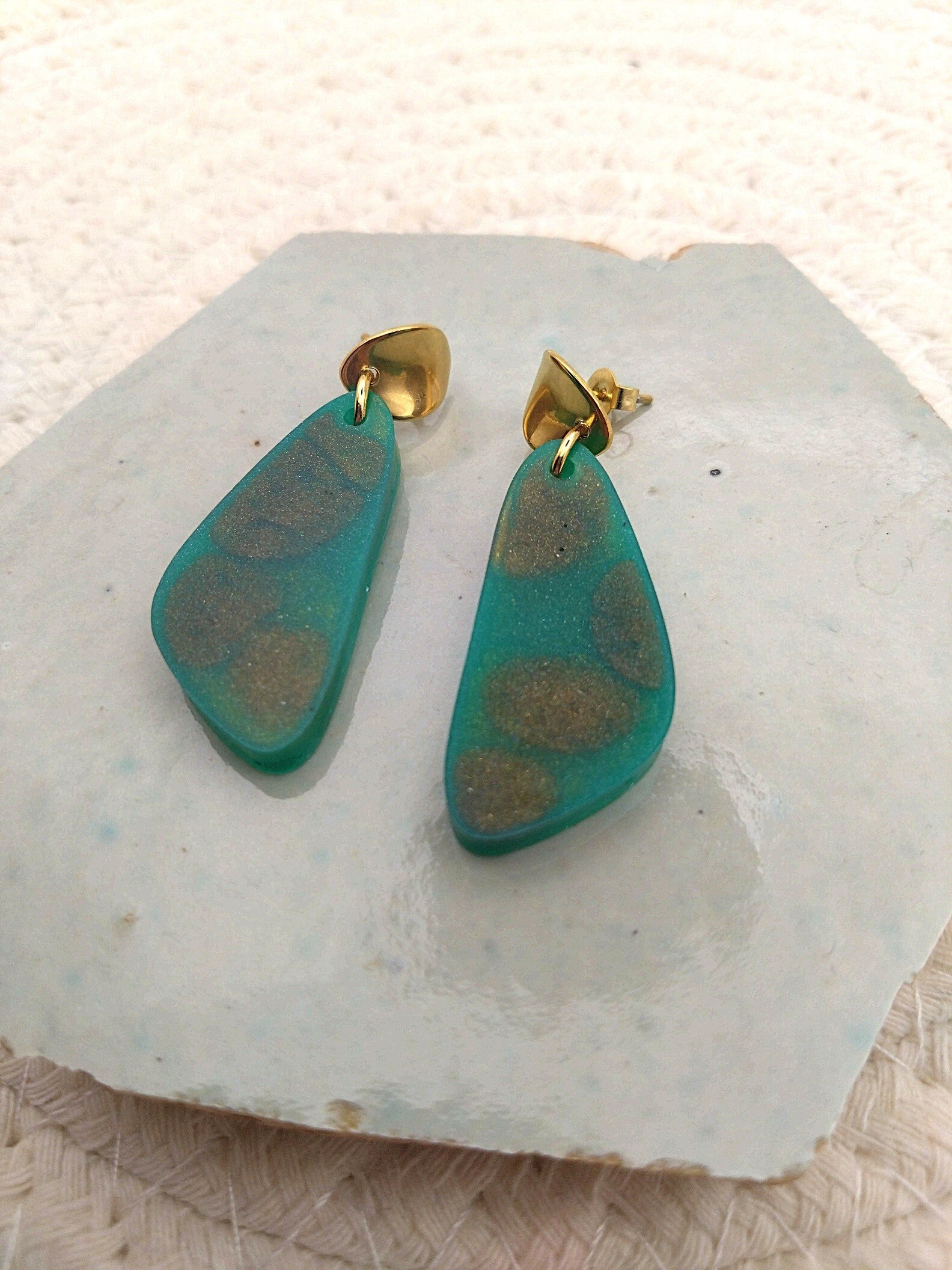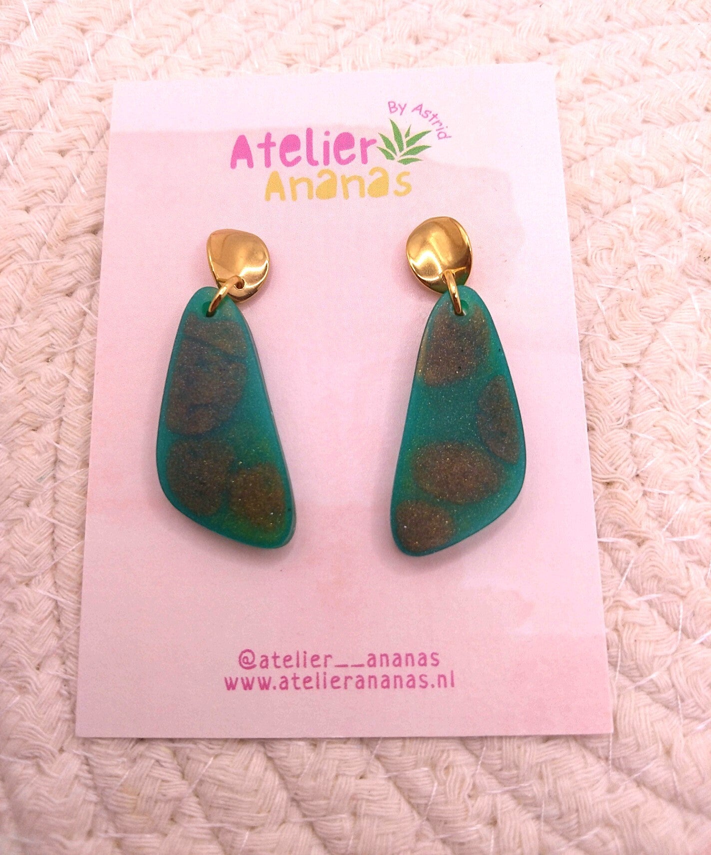 Deze warm gekleurde oorbel is gemaakt van epoxy met donkergroen en parelmoer brons gekleurde tinten. De oorsteker is gemaakt van roestvrij staal. De oorbel is in lengte +/- 4,5cm.