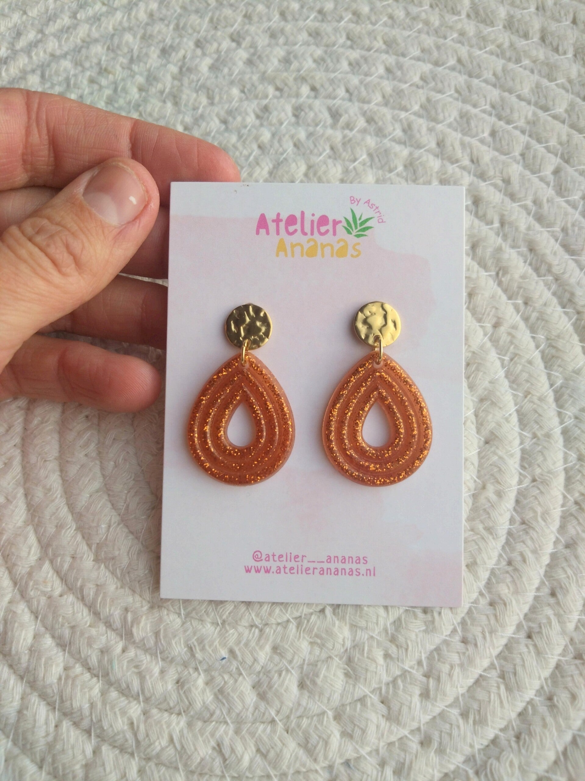 Deze feestelijke oorbellen zijn gemaakt van bruin gekleurde epoxy met bronsgekleurde glitters. De oorsteker is gemaakt van roestvrij staal. De oorbel is in lengte +/- 4,5cm.