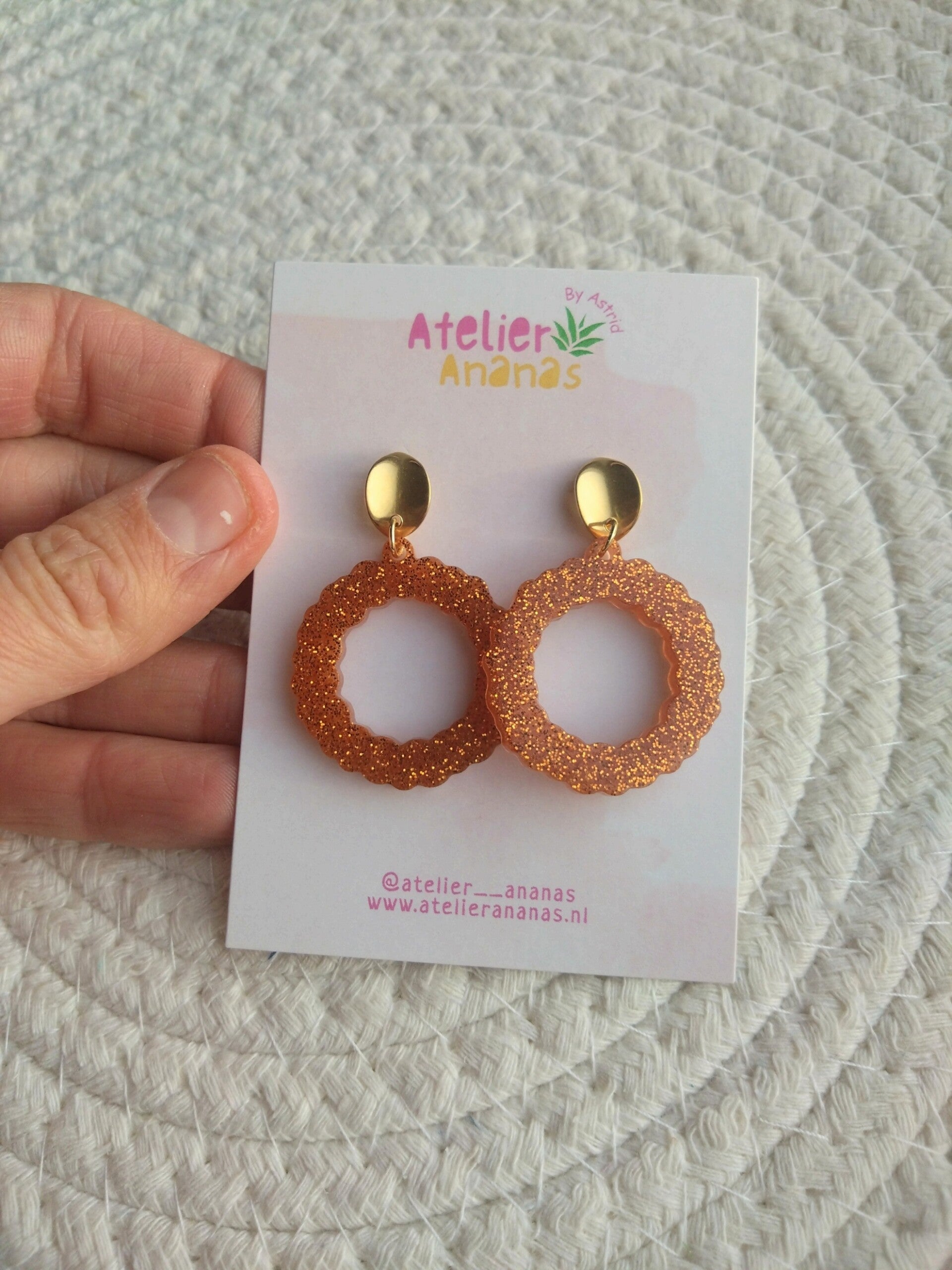 Deze feestelijke oorbellen zijn gemaakt van brons gekleurde epoxy met glitters. De oorsteker is gemaakt van roestvrij staal. De oorbel is in lengte +/- 4,5cm.